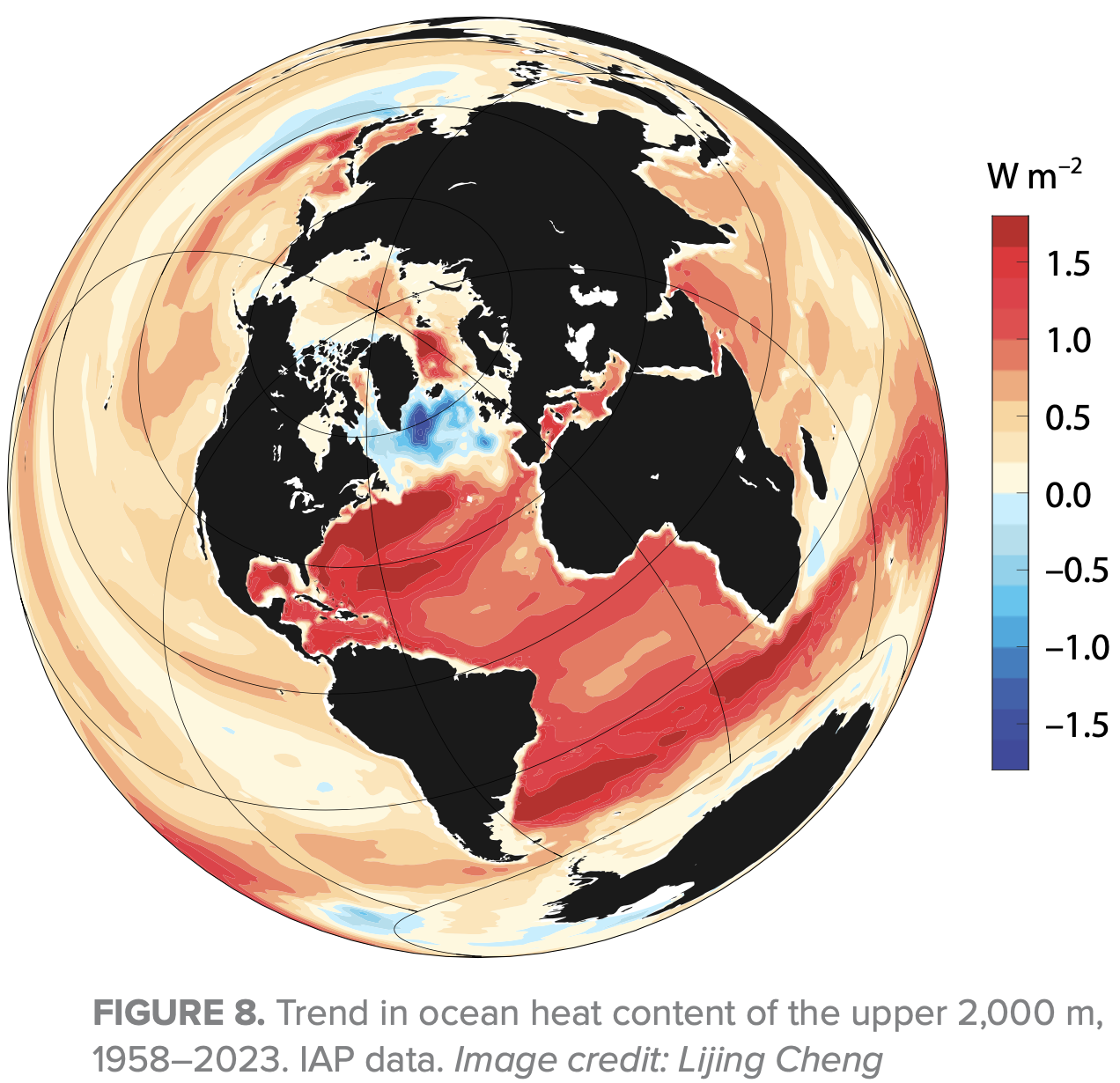 The cold blob is not just a surface phenomenon; it is also clearly vis- ible (Figure 8) in the trend of ocean heat content of the upper 2,000 m (Cheng et al., 2022).