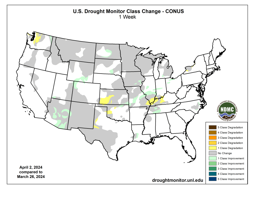 US Drought Monitor one week change map ending April 2, 2024.
