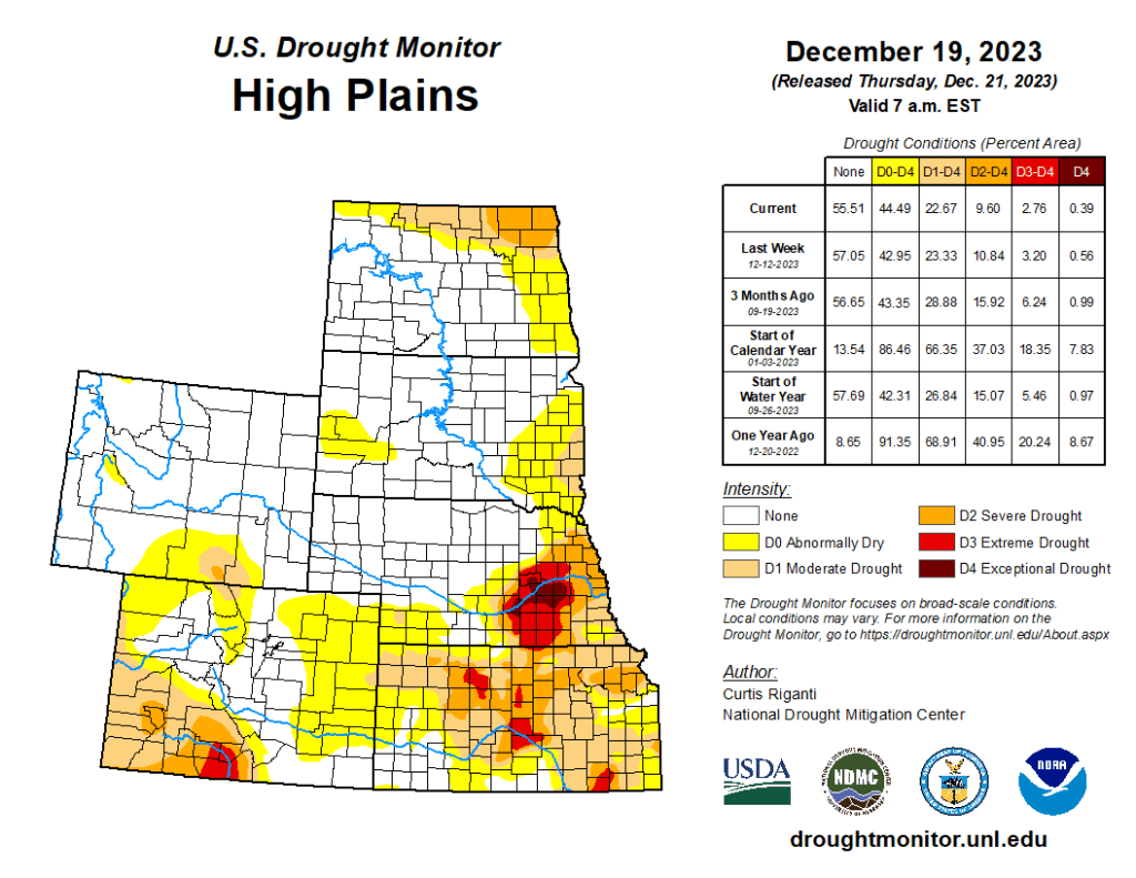 A weather system bringing rain and snow moved through the High Plains midweek last week. Central and northern states experienced up to 400% of normal precipitation. Northeastern Colorado and eastern Colorado saw improvements in Exceptional (D4), Extreme (D3), and Severe (D2) drought conditions. These improvements are a continuation of improvements seen last week. The weather system that brought improvements to much of the High Plains largely missed north-central Colorado. Conditions worsened, introducing abnormal dryness and degrading from Abnormally Dry (D0) to Moderate Drought (D1). Northern Wyoming experienced similar conditions to Montana, leading to small Abnormally Dry (D0) and Moderate Drought (D1) expansions along the northern border with Montana…