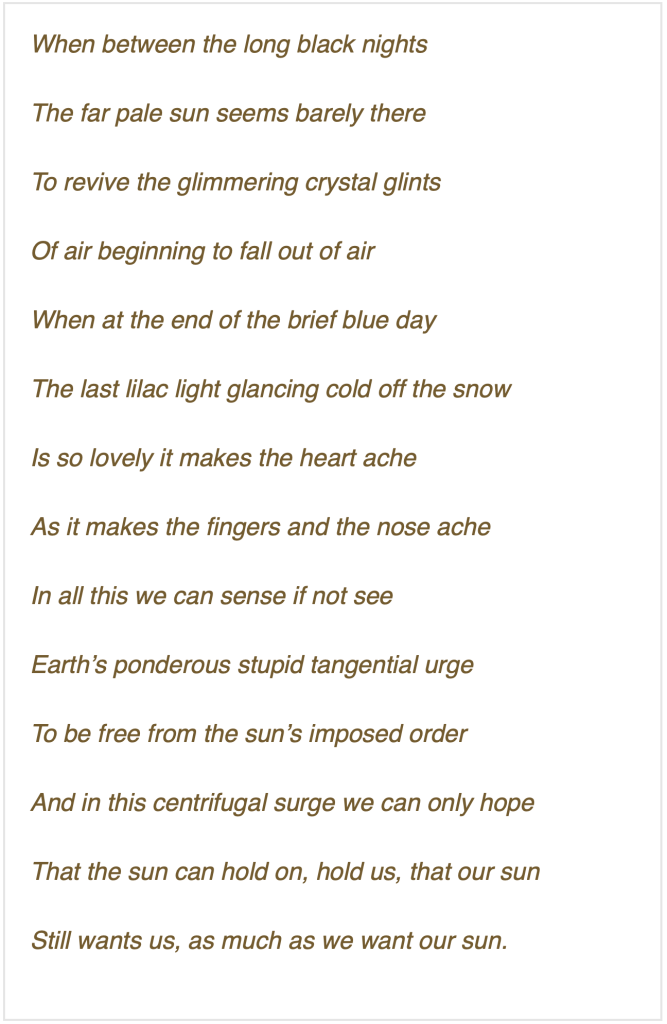 But โ โEarthโ: had we seen it first from above like we can now, from satellites on the upper edge of our atmosphere, we would have called the planet โWater,โ or maybe more romantically, โOceania.โ Water covers 70 percent of the planet; we are a planet awash in water. Where the water came from, we can only hypothesize; but we have it โ and we are also just the right distance from the sun we circle so that a lot of our water is in its liquid form. A few million miles closer to the sun and our water would be vapor in the atmosphere, as on Venus; a few million miles farther away, and the oceans and land would lie under deep layers of ice โ the recent Pleistocene writ larger. But we are in the โsweet spotโ between those extremes, where the tilt of the planet is such that in our yearโs passage around the sun, most of us are getting a taste of both the water-as-ice world and the water-as-vapor world, winter and summer; but thanks be, water-as-liquid continues to be where, or what, most of the water is.
