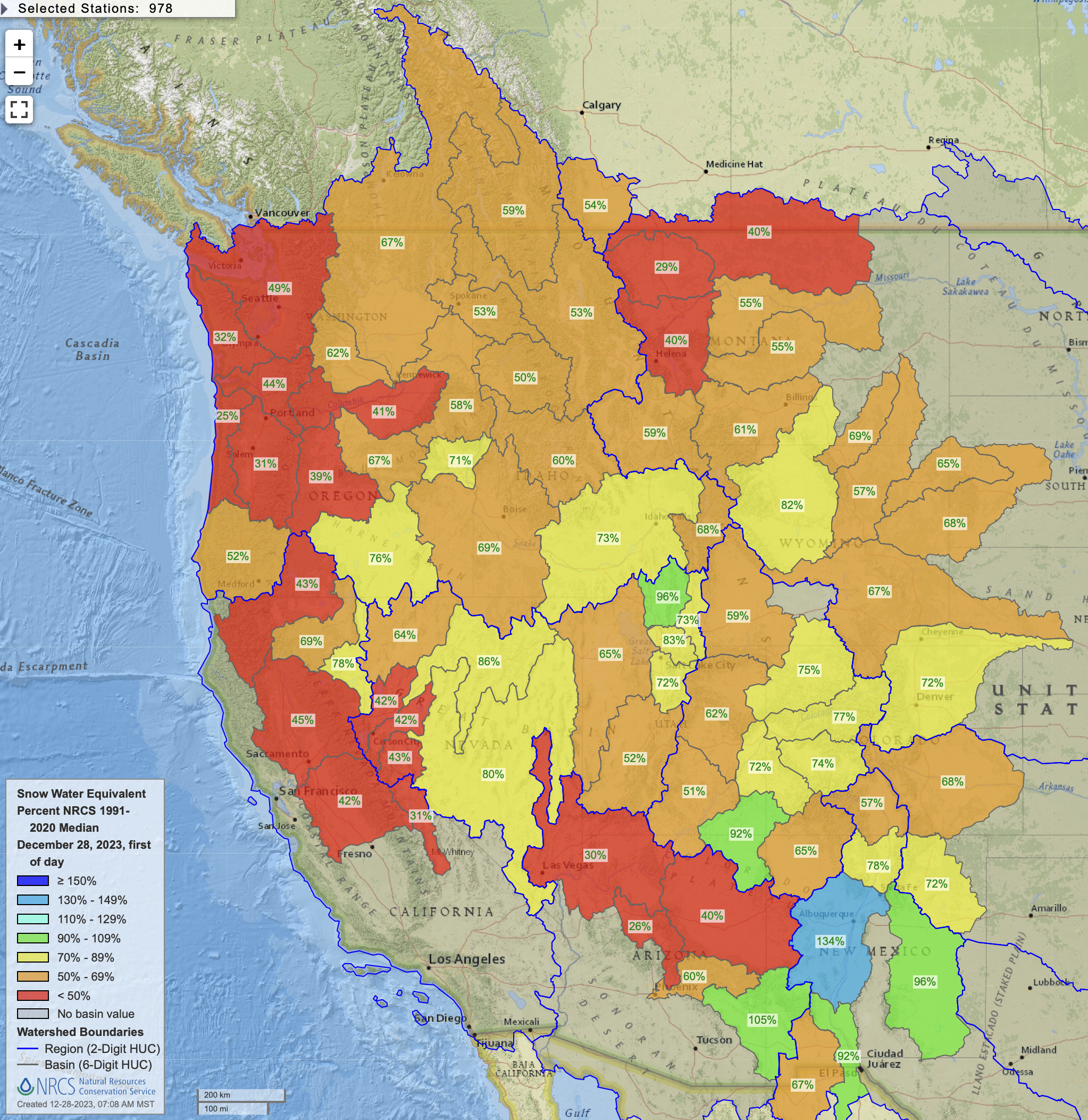 Westwide SNOTEL basin-filled map January 5, 2024 via the NRCS.