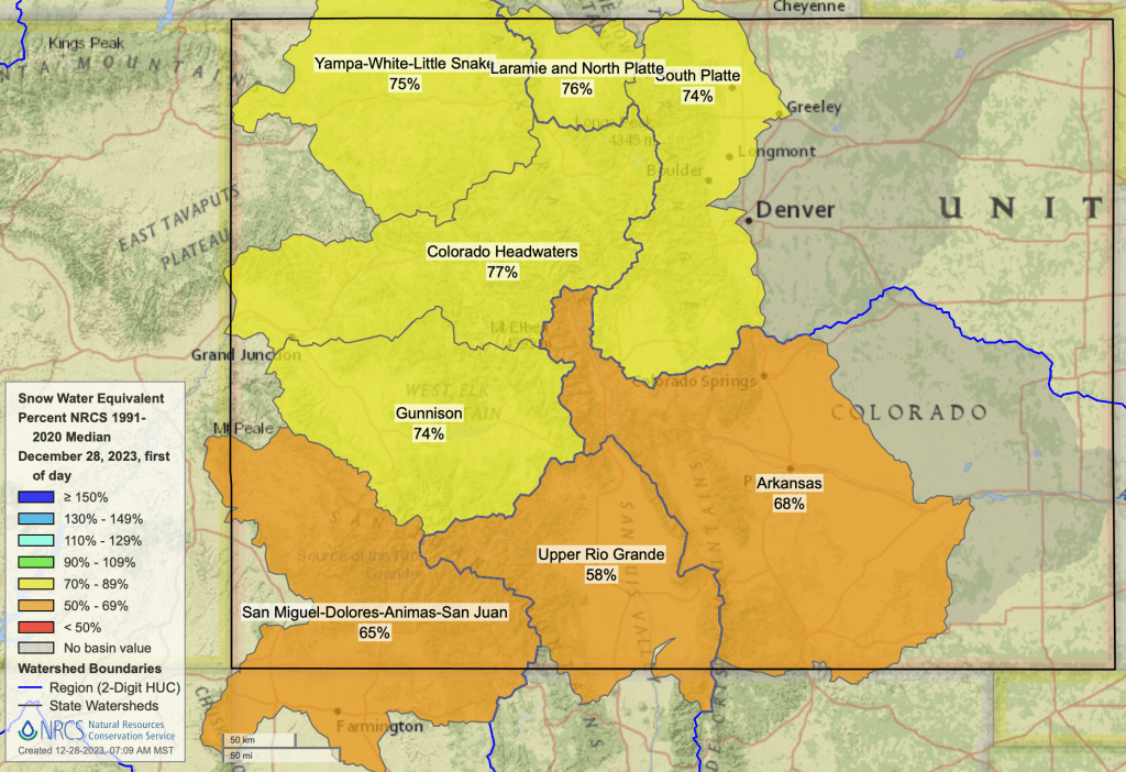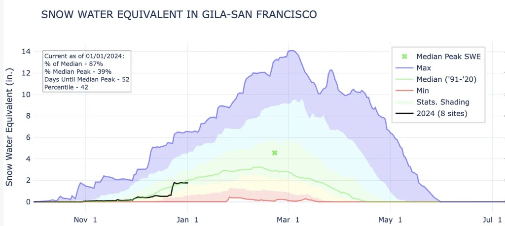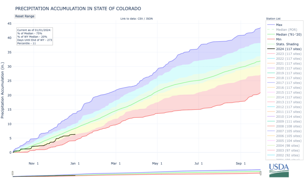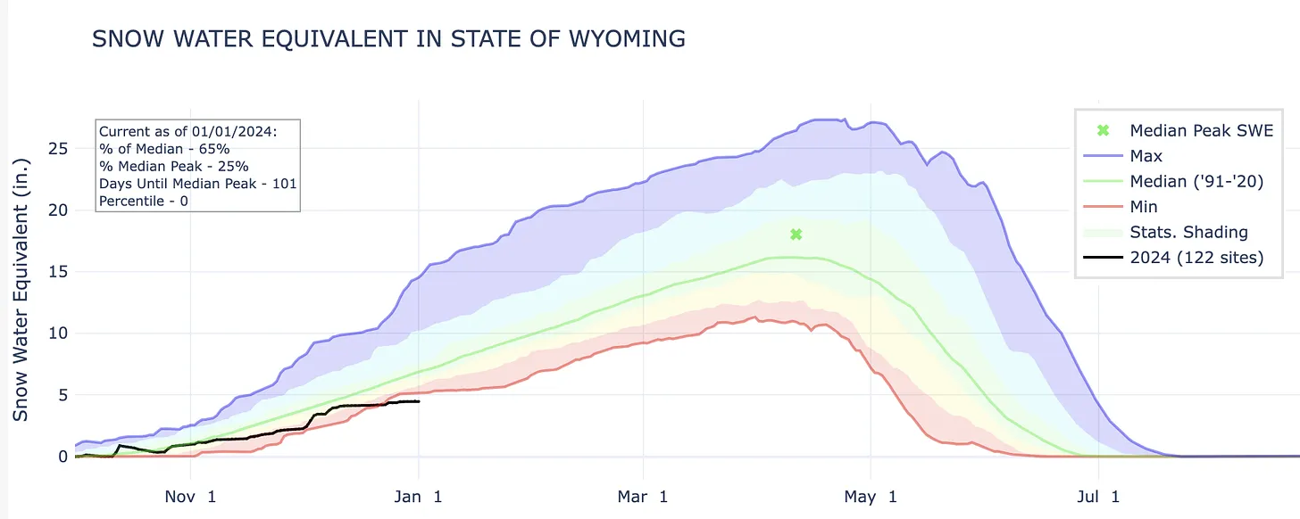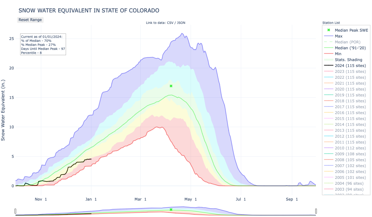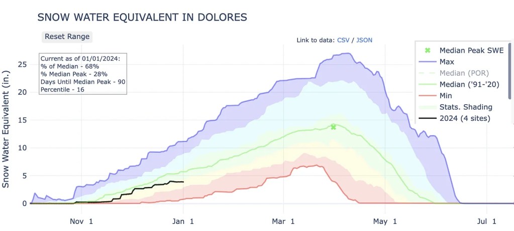 Snowpack in the southern Rockies entered 2024 with a weak start. There is still a lot of winter left to go, but beginning a new year with a significant snowpack deficit always brings a certain amount of hand-wringing from skiers and water managers alike.