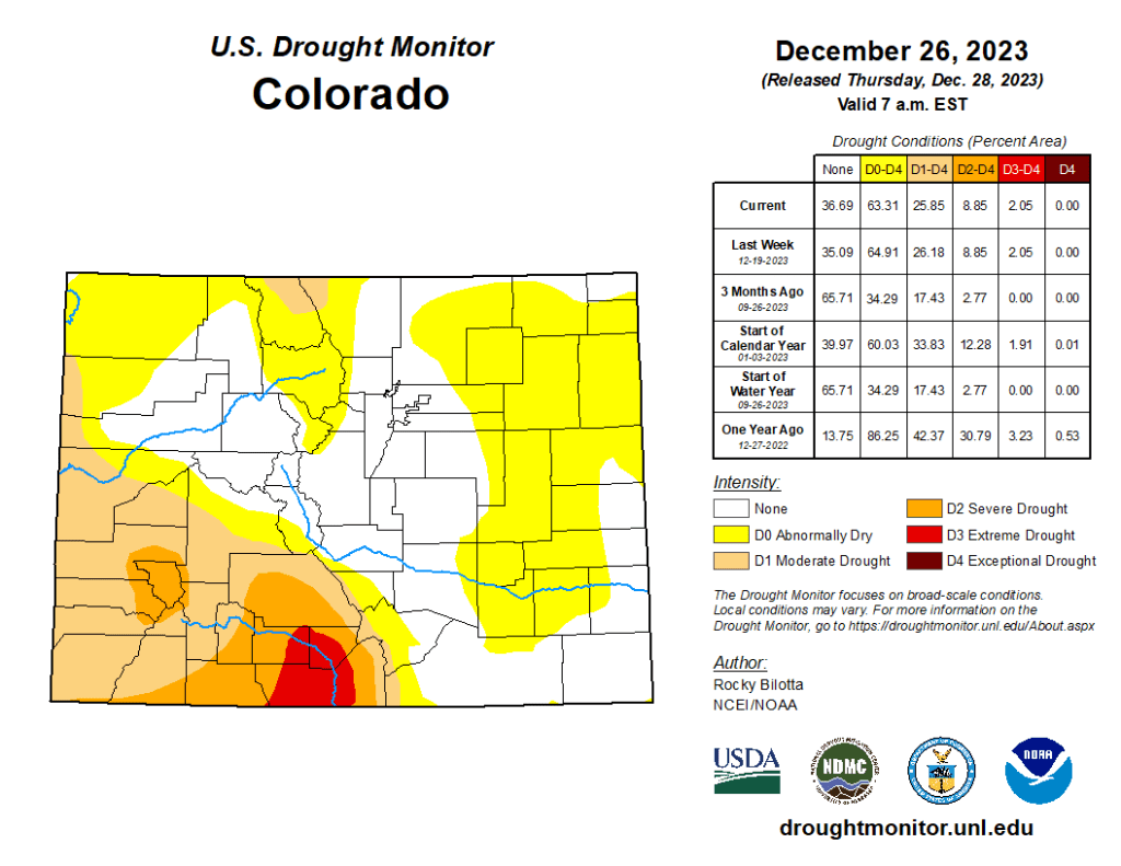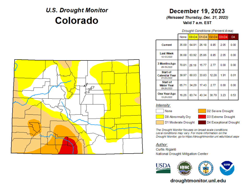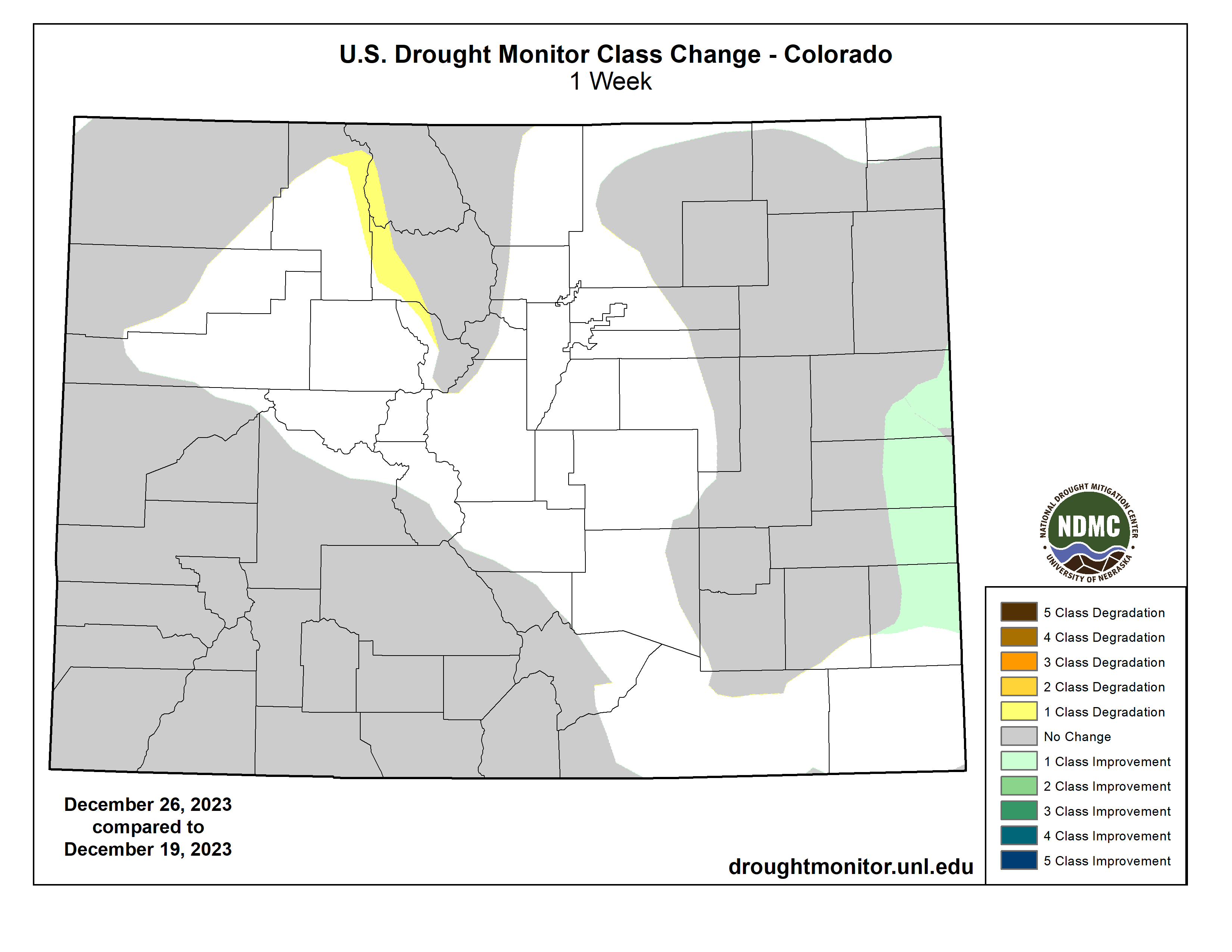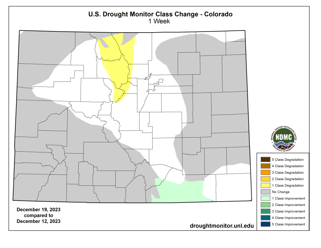 Colorado Drought Monitor one week change map ending December 19, 2023.