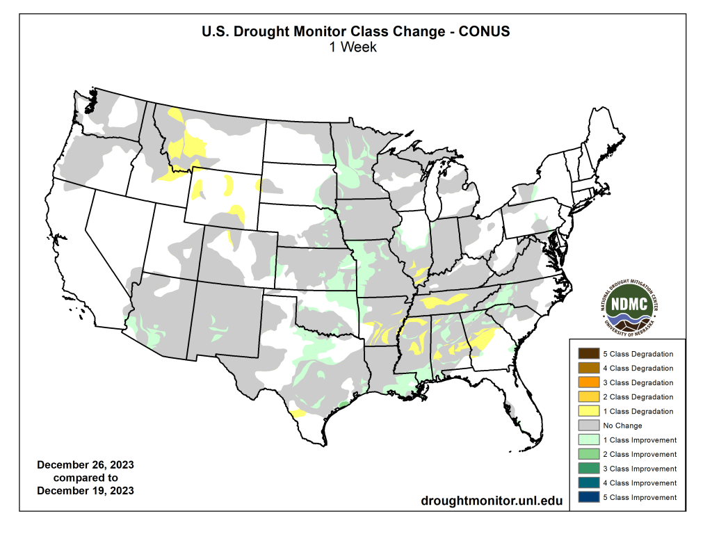 US Drought Monitor one week change map ending December 19, 2023.
