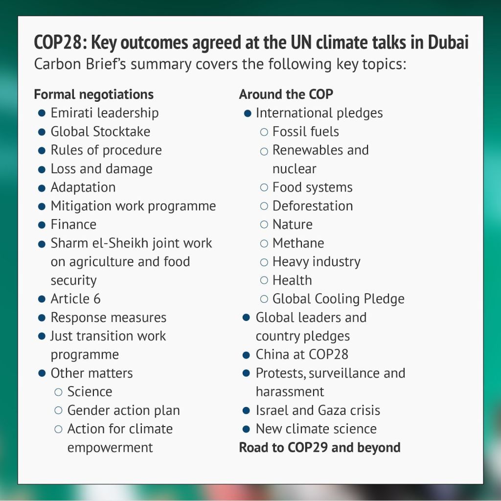 Here, Carbon Brief provides in-depth analysis of all the key outcomes in Dubai โ both inside and outside the COP.