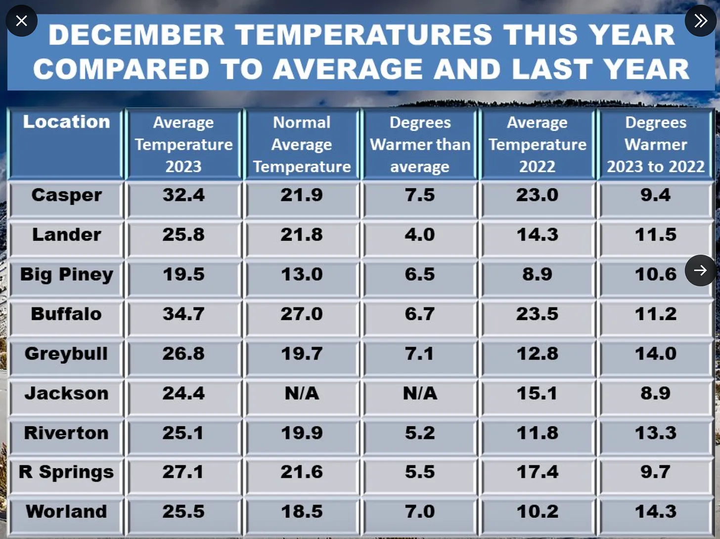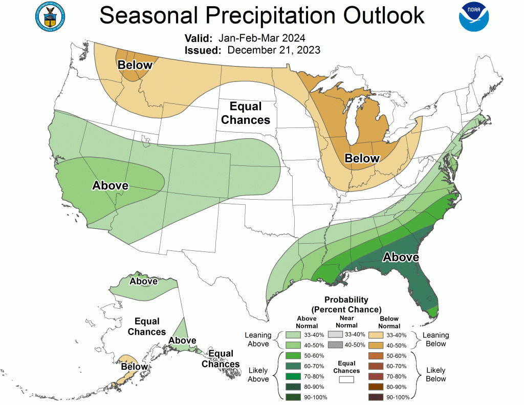 The National Weather Service Climate Prediction Centerโs 6-10 day outlook (valid Jan. 3-9, 2024) favors above-normal precipitation for most of the country, with high probabilities found in the intermountain West, east of the Ohio and Mississippi River Valleys, Alaska and Hawaii. Only southern Texas is expected to have below-normal precipitation. There is an increased probability of below-normal temperatures west of the Rockies, particularly in the southwest. Following the precipitation trend, areas of probable heavy precipitation in the east also have the probability of being warmer than normal. The Northeast has the largest probability of having above-normal temperatures.
