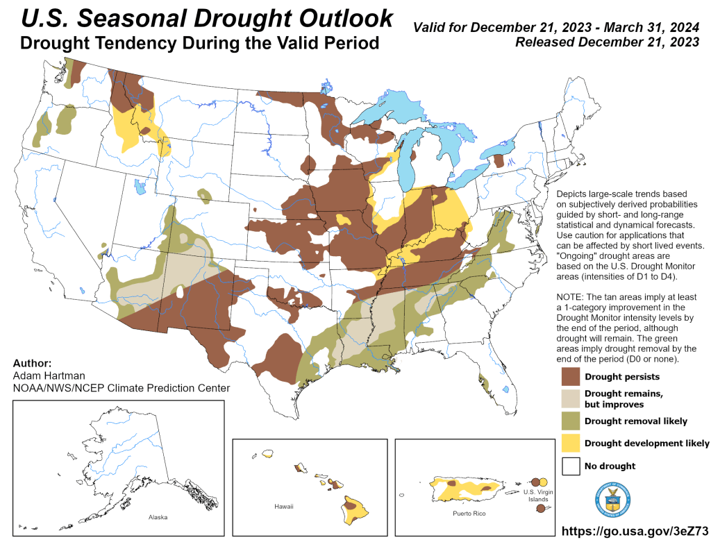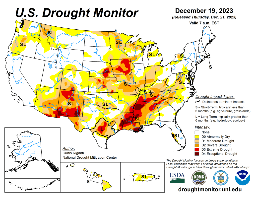 A small part of southeastern Louisiana and southern Mississippi saw minor improvements. The High Plains benefited from a rain and snow weather system that moved through the area before the new year. Northeastern Colorado into eastern Nebraska had some improvement. Northern Colorado and Wyoming experienced deterioration without the benefit of the precipitation that fell further east and low snow water equivalent (SWE). The north-central Midwest had some improvements from the same storm that benefited the High Plains. Central, eastern and southern Midwest largely missed precipitation, causing deterioration in eastern Ohio, southern Indiana and Illinois, and eastern and northern Kentucky where groundwater and streamflow remain low. The West saw few improvements, except for New Mexico. Lack of precipitation and low SWE in higher elevations have left areas of Montana and Arizona worse off than last week…