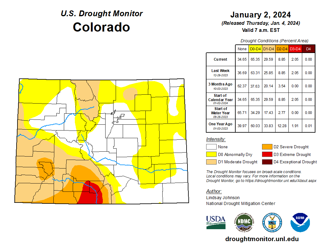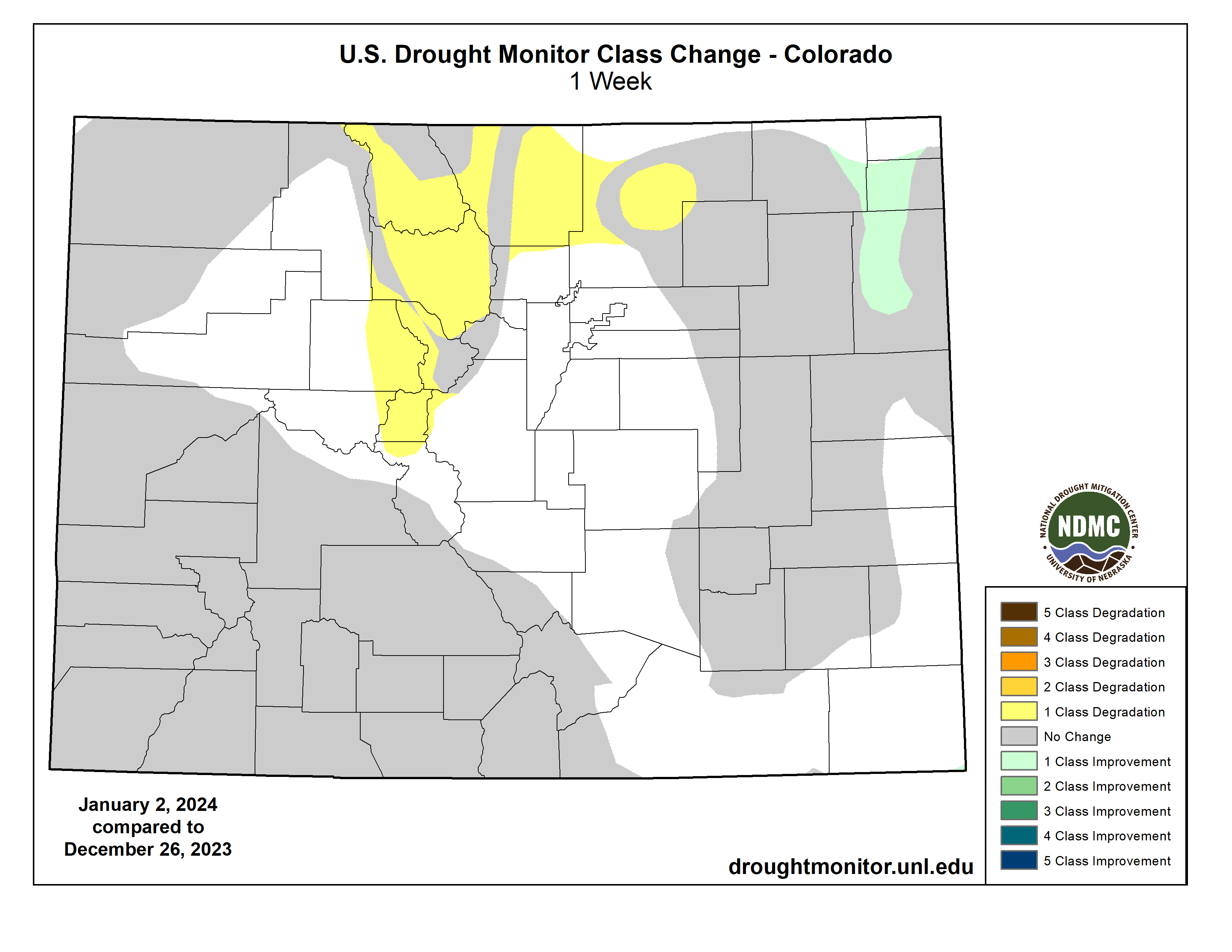 Colorado Drought Monitor one week change map ending January 2, 2024.
