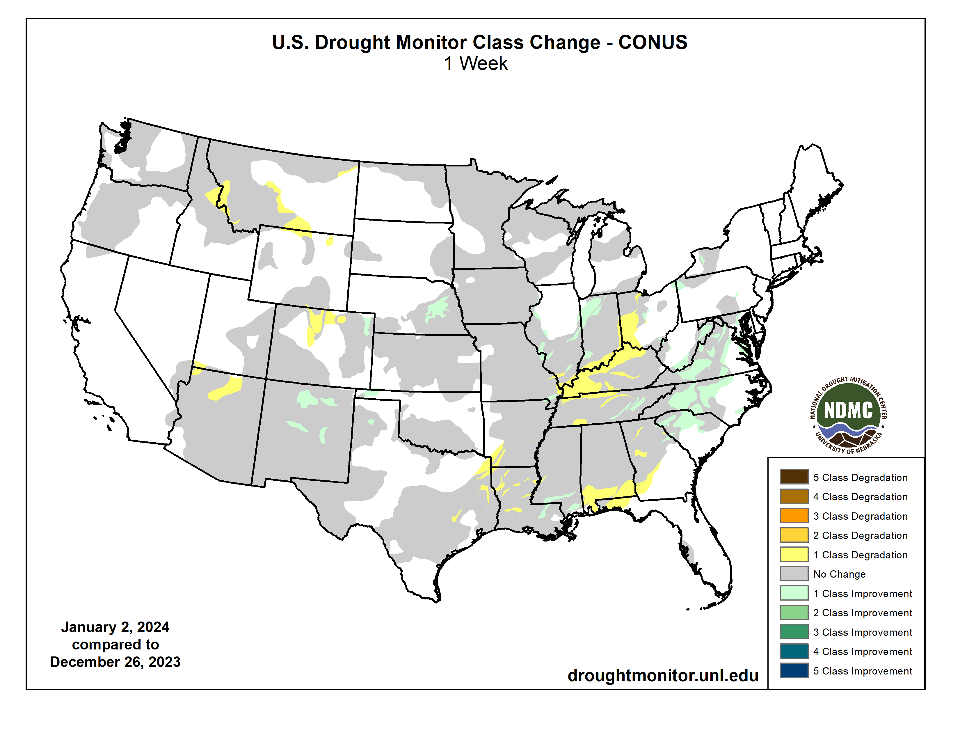US Drought Monitor one week change map ending January 2, 2024.