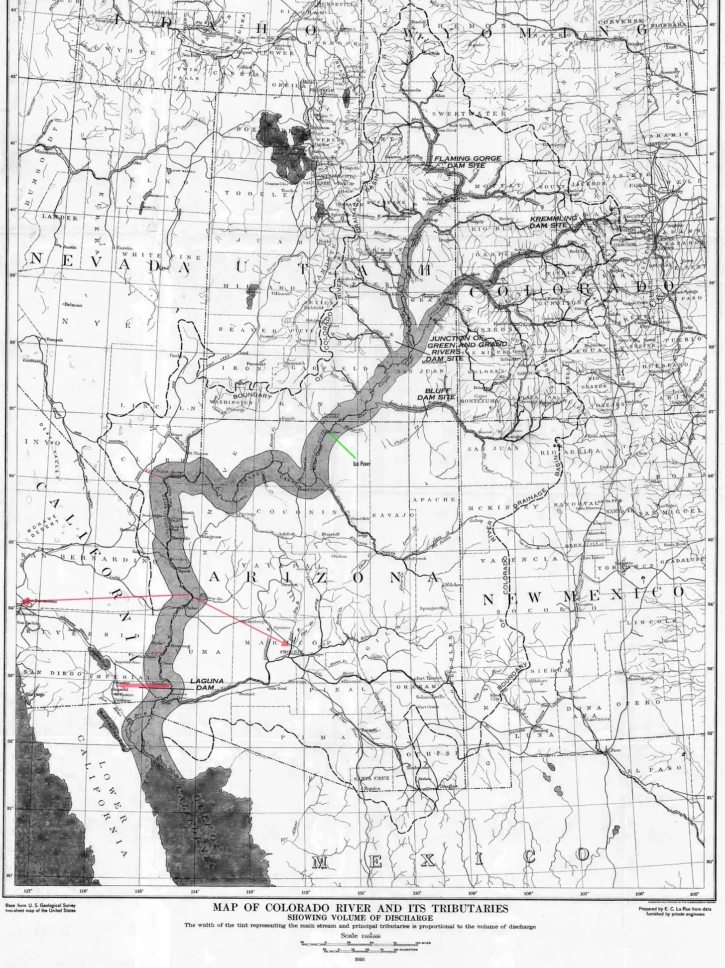Zoom in on the profile and you’ll see that Glen Canyon Dam was still only an itch in Floyd Dominy’s proverbial pants. It got built not long afterward, though. Also proposed: The Marble Canyon and Bridge Canyon Dams in the upper and lower Grand Canyon, respectively; a whole series of dams on the lower San Juan River; the Echo Park Dam on the Green and Yampa; the Dark Canyon, Moab, Dewey, and Whitewater Dams on the Colorado River between Grand Junction and Glen Canyon; and the Desolation and Rattlesnake Dams on the Green River.