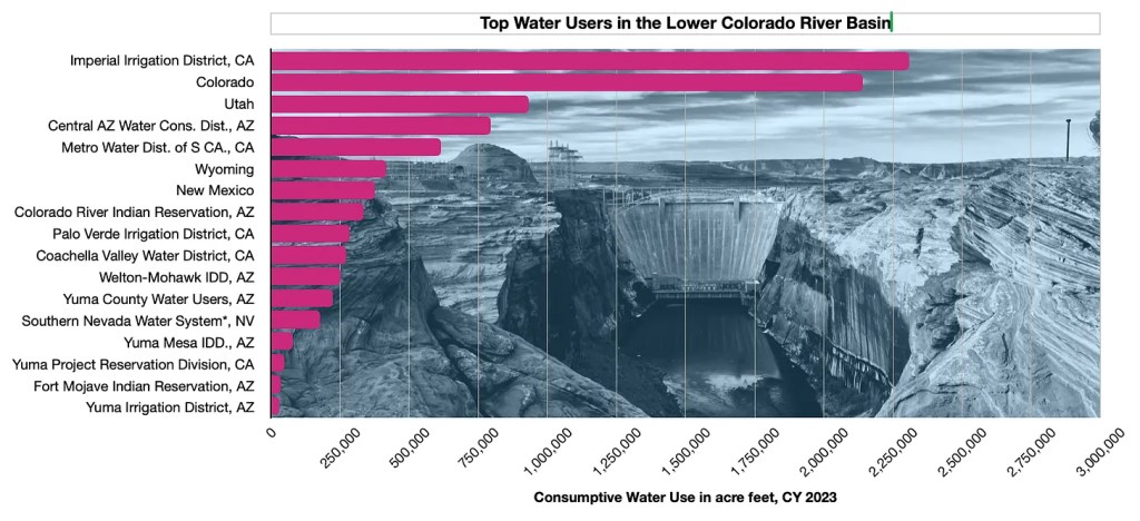 Okay, that’s a rather crude way of explaining a rather complicated situation, but it’s really not that far off. For example, in 2023, the Imperial Irrigation District in Southern California consumed 2.3 million acre-feet of Colorado River water; the entire state of Colorado used just 2.1 million acre-feet (MAF).2