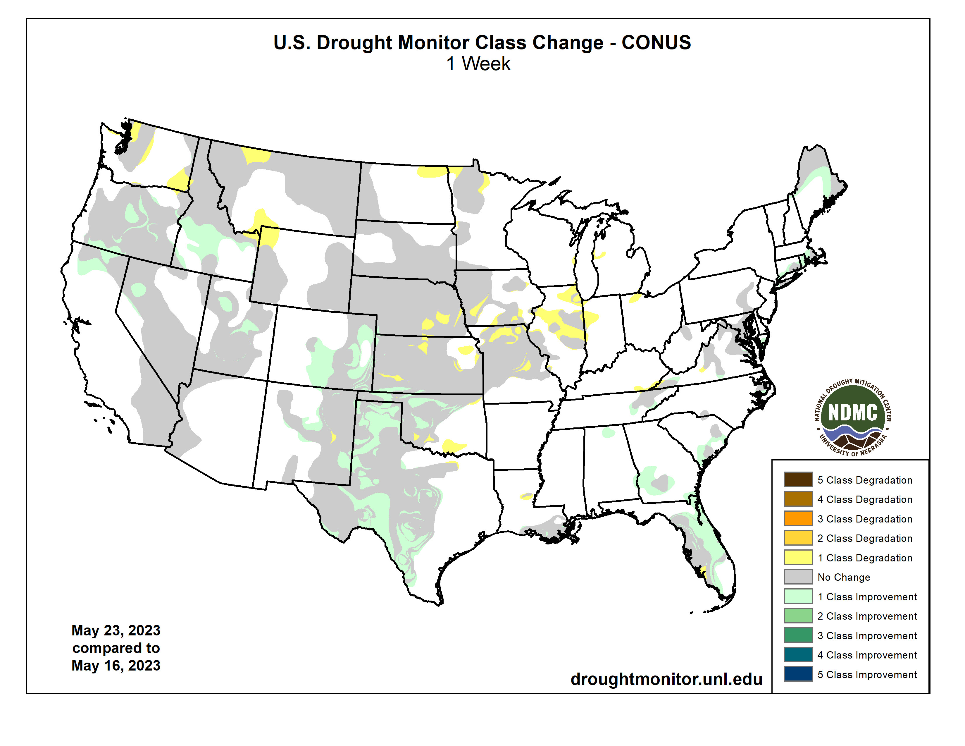 US Drought Monitor one week change map ending May 16, 2023.