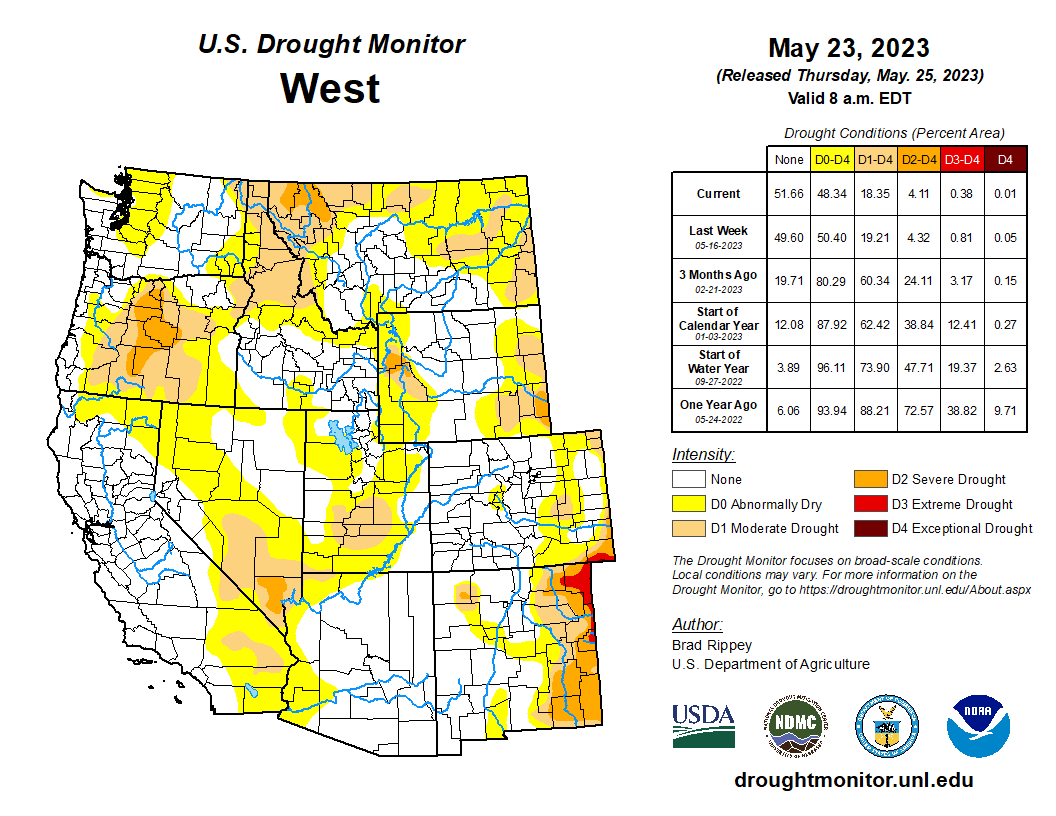 Aside from some heavy precipitation in the central Rockies and environs, much of the West experienced warm, mostly dry weather. As a result, there were only minor Western changes to the drought-depiction, some due to further assessment of the impact of cold-season precipitation as the snow-melt pace accelerated. Indeed, a Northwestern heat wave—rare for this time of year—resulted in multiple monthly record highs, starting on May 14. On that date in Oregon, both Astoria and Seaside attained 93°F. Astoria tied a monthly record, originally set on May 16, 2008, while Seaside toppled its monthly mark of 86°F, attained most recently on May 19, 1978. Notably, Portland, Oregon, achieved highs of 90°F or greater on 4 consecutive days, from May 12-15. Prior to this year, Portland’s May record of three 90-degree readings occurred in 1947 and 1987, with only the latter being observed on 3 consecutive days (May 6-8, 1987). Meanwhile in Washington, Hoquiam (91°F on the 14th) posted a monthly record high, shattering the standard of 87°F originally set on May 29, 2007. With a high of 92°F on the 14th, Quillayute, Washington, tied a monthly record first achieved on May 7, 1987. Elsewhere, Western reservoir storage as a percent of average for the date reflected varying degrees of drought recovery. As May began, California’s 154 primary intrastate reservoirs held 28.6 million acre-feet of water, 104 percent of average. However, storage on that date in the Colorado River basin was 15.5 million acre-feet, just 48 percent of average. Still, the surface elevation of Lake Mead has risen nearly 9 feet since setting an end-of month record low of 1,040.92 feet in July 2022…