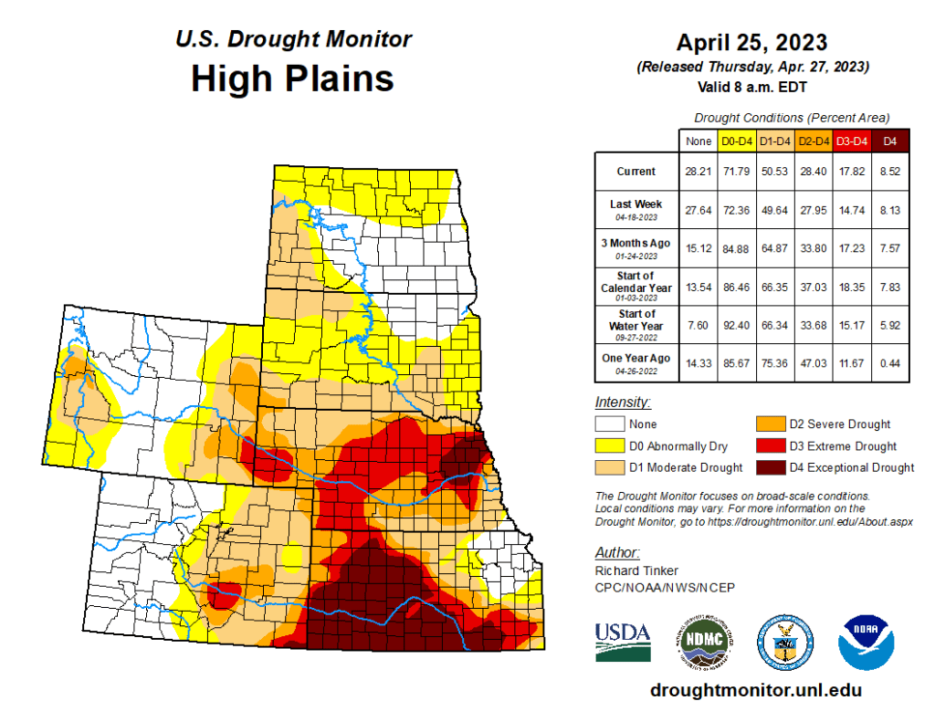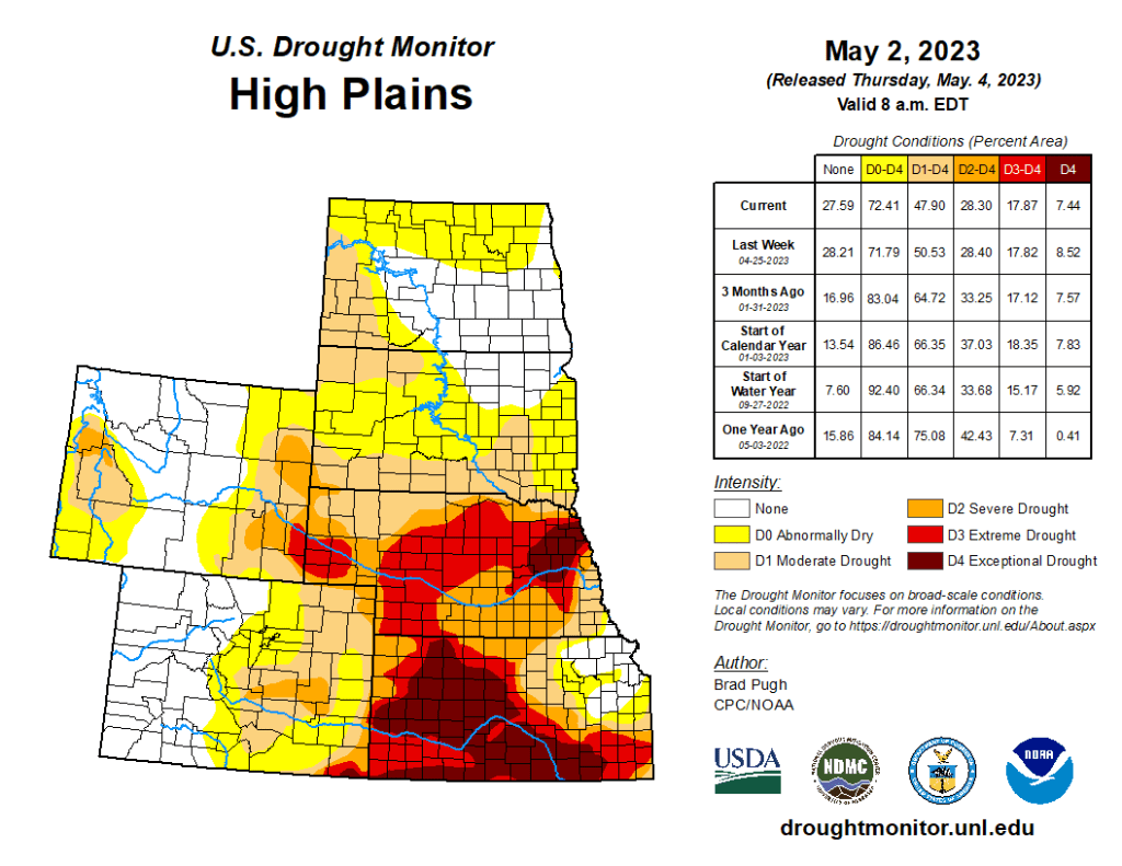 Rainfall of 1.5 to 2 inches, or more, during the past week along with SPI at various time scales and soil moisture supported a 1 to 2-category improvement to southeastern Colorado. For similar reasons, a 1-category improvement was made to southwestern Kansas. However, 12-month SPI still supports D3-D4 across much of western and central KS. Wichita has only received 0.72 inches of precipitation from March 1 to April 30, which made it the 2nd driest March and April on record and the driest since 1936. Based on the NDMC’s short and long-term objective blends and CPC’s leaky bucket soil moisture, D1-D3 expansion was warranted for northern Kansas and south-central Nebraska. D3 was increased westward across west-central Nebraska following a very dry April. North Platte tied the driest April on record. Degradations were also made to southeastern Kansas based on 60 to 120-day SPEI. Abnormal dryness (D0) coverage increased in northeastern Wyoming based on recent dryness and declining soil moisture. A small improvement was made to the southwest corner of South Dakota, based on a local report that was consistent with VegDri and objective drought blends…