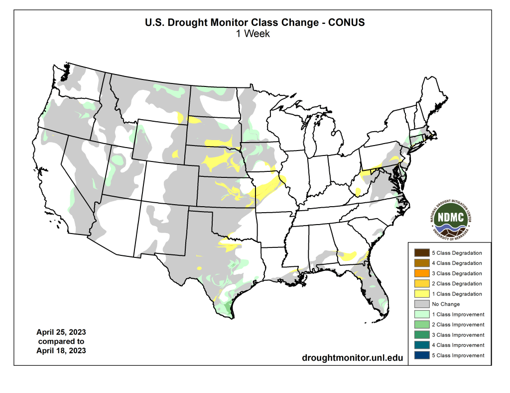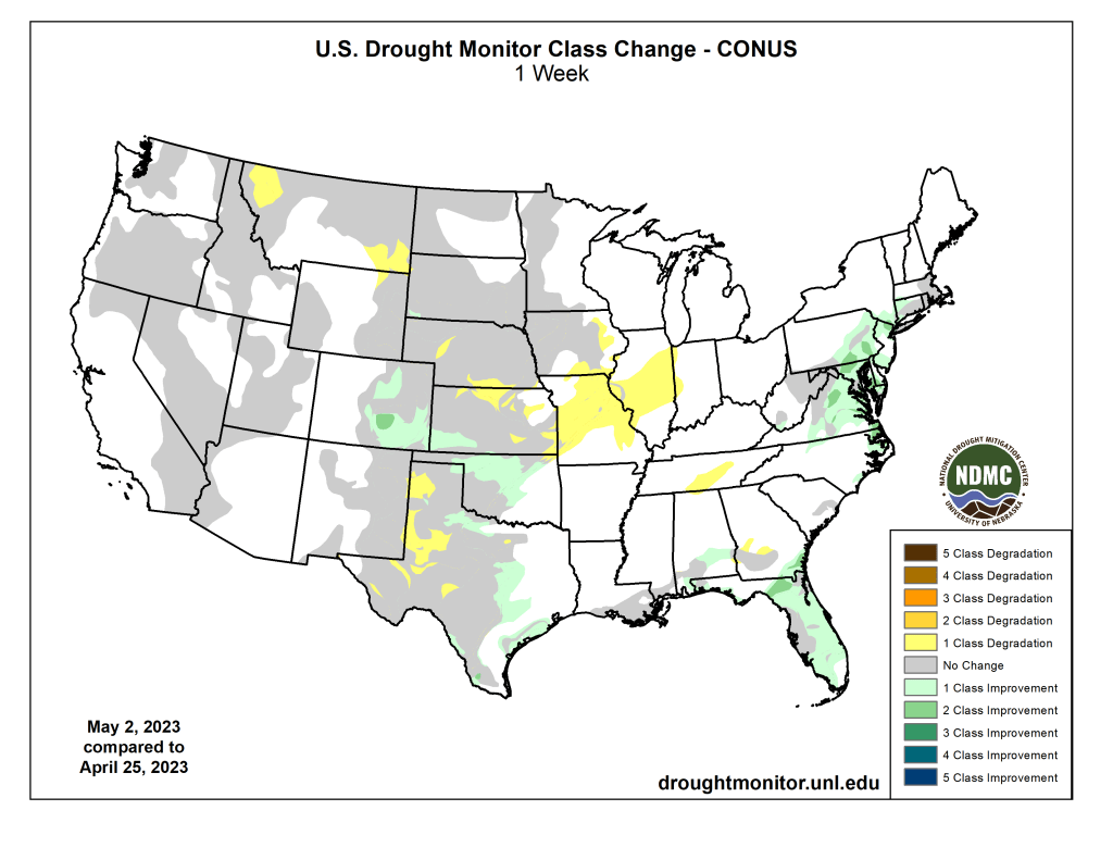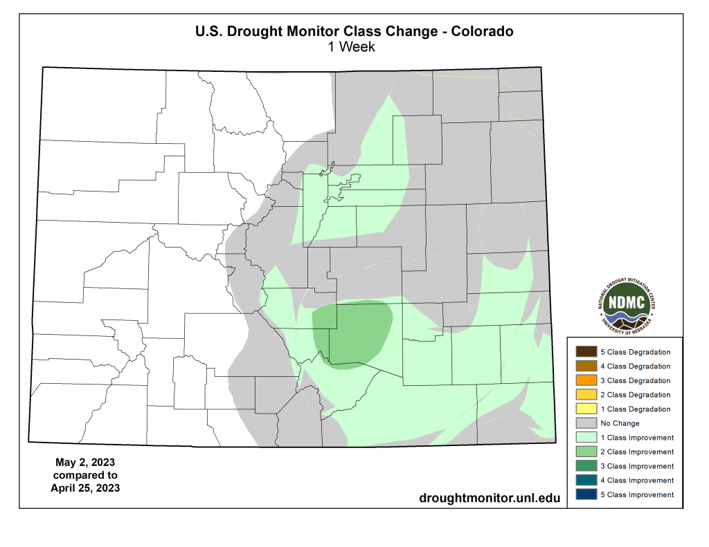 Colorado Drought Monitor one week change map ending May 2, 2023.