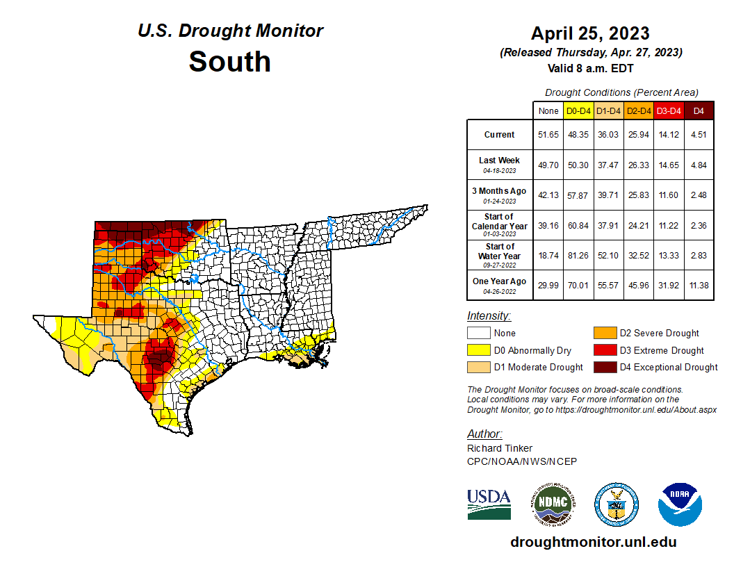 Balancing longer term SPIs and recent widespread rainfall (1 to 3.5 inches), a 1-category improvement was made to parts of Oklahoma and Texas. Improvements were also made to parts of central Texas along with the Texas Gulf Coast after more than 1.5 inches of rainfall this past week. CPCโs leaky bucket soil moisture and 90 to 120-day SPI supported a slight expansion of moderate (D1) to severe (D2) drought in west-central Texas. Based on soil moisture considerations and impact reports (very dry pastures), extreme (D3) drought was increased in coverage across the Texas Panhandle. The addition of abnormal dryness (D0) in east-central Tennessee was based on increasing 30-day deficits, SPEI, soil moisture, and 28-day average streamflows…