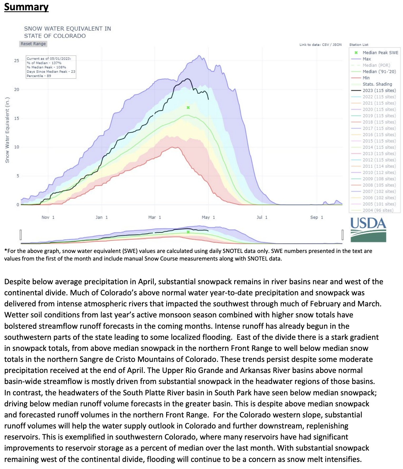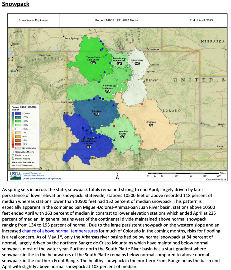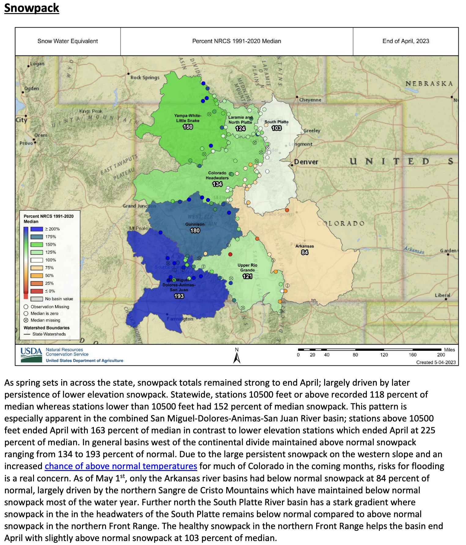 Denver, CO โ May 4th, 2023ย โ In addition to above normal snowpack across much of the state, primarily in Western Colorado, lower elevation snowpack were particularly plentiful leading to substantial early season runoff in some basins. Along with this low elevation snowmelt, significant flooding has already been observed in the Yampa and Dolores basins with still much more snowmelt to come. While much of Western Colorado experienced above normal April streamflow volumes this was not the case across the entire state. NRCS Hydrologist Karl Wetlaufer commented โPeak snowpack and streamflow forecasts for the full April-July runoff period vary widely across the state this year. While much of Western Colorado should expect a continuing trend of above normal streamflow, much of the Arkansas and South Platte basins are forecasted for well below normal seasonal runoff volumes.โ Portions of the Colorado River headwaters and portions of the Rio Grande River basins are also anticipated to have below normal streamflow over the coming month.
