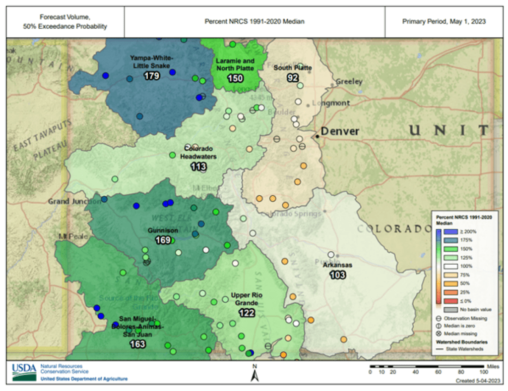 May 1, 2023 Colorado streamflow forecast. Map credit: NRCS