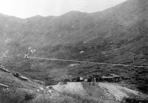 Vidler tunnel entrance and exit, Summit County side of range. Date: [1900-1905]. Summary: An “X” on the image marks the spot of the Vidler tunnel portal in a gulch above timberline, Summit County, Colorado. Men pose near a log cabin in the foreground. Photo credit: Brandes, Juan F via Denver Public Library