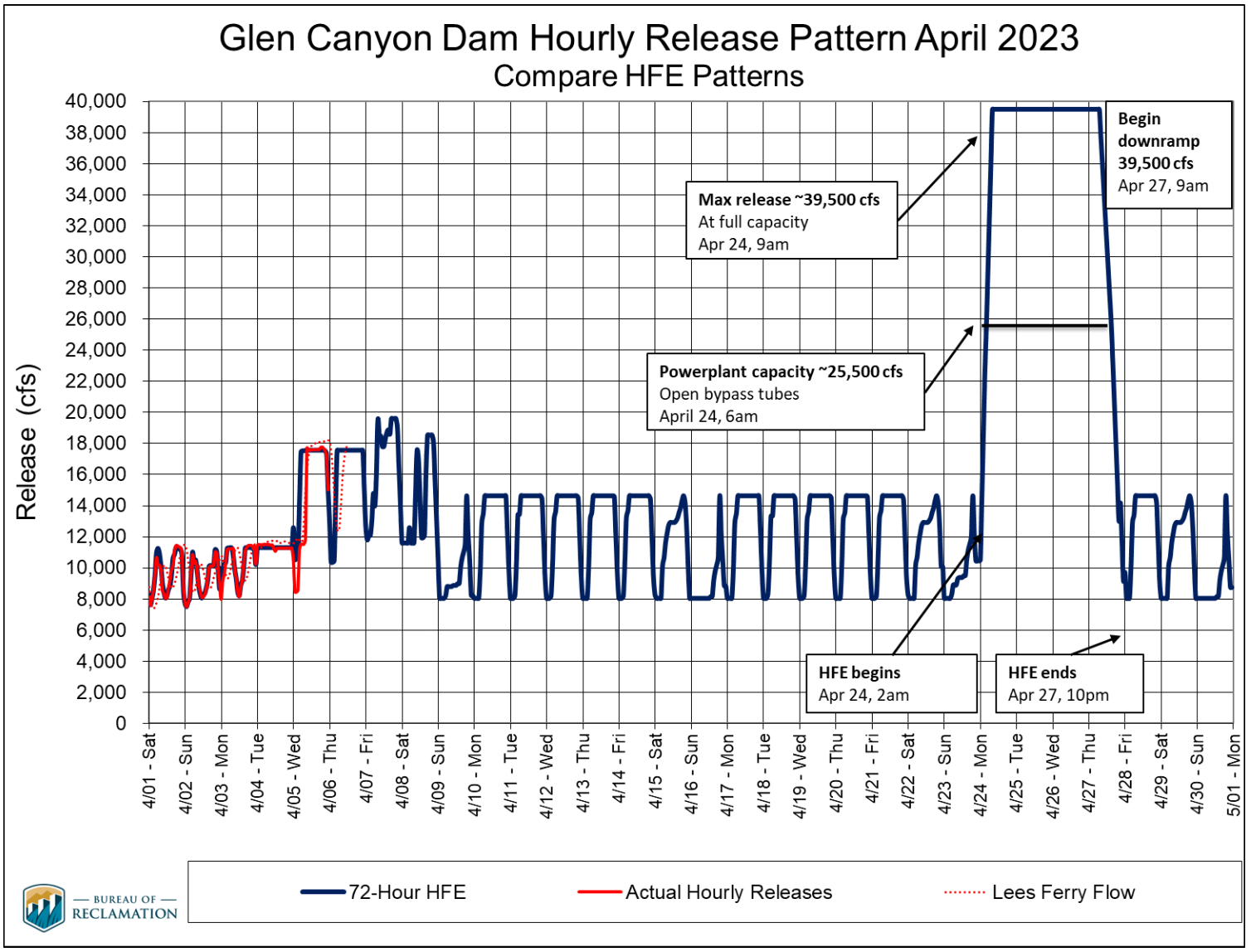 This weekโ€™s HFE will be pretty dramatic, both visually and scientifically. The flow will begin early Monday morning (April 24, 2023) and last into Thursday evening (April 27, 2023.) The dam will ramp up releases to 39,500 cubic feet per second (CFS) and hold that for 72 hours straight creating a flood that will flow all the way to Lake Mead over a period of about a week, rebuilding sandbars and beaches along the way (and giving rafters in the canyon an exciting ride!) One additional key point to understand is that HFEโ€™s consume no net loss of water in Lake Powell โ€“ after the HFE occurs, Glen Canyon dam will release slightly less water than normal over a period of weeks, in order to make up that amount of water that is shot downstream, yet another benefit in the design in these critically important High Flow Experiments.