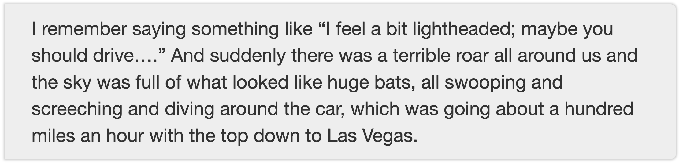 Thereโs moment in that opening passage of โFear and Loathing in Las Vegasโ where our author and guide is heading up Interstate 15 from LA to Las Vegas when the drugs start kicking in.