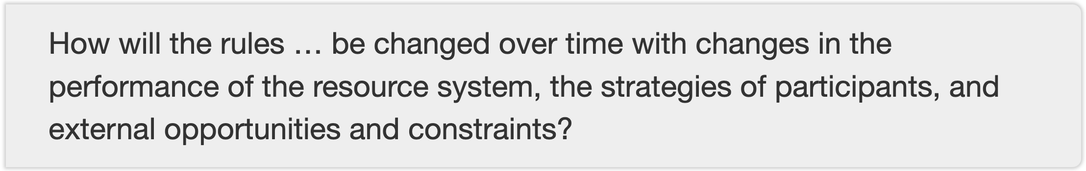 In a classic 2012 paper, the late Elinor Ostrom offered the version I most like of her ever-evolving โdesign principlesโ for resource institutions. This is the version I cited in my 2016 book Water is For Fighting Over, the one I have students read and apply. The final bullet seems relevant to the current discussion: