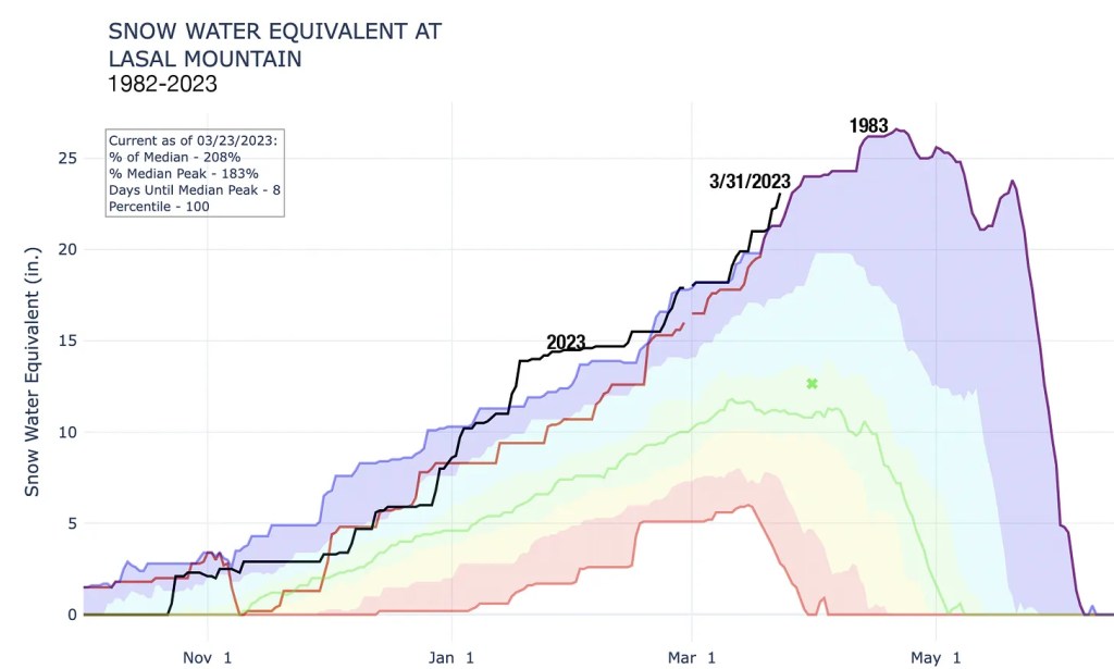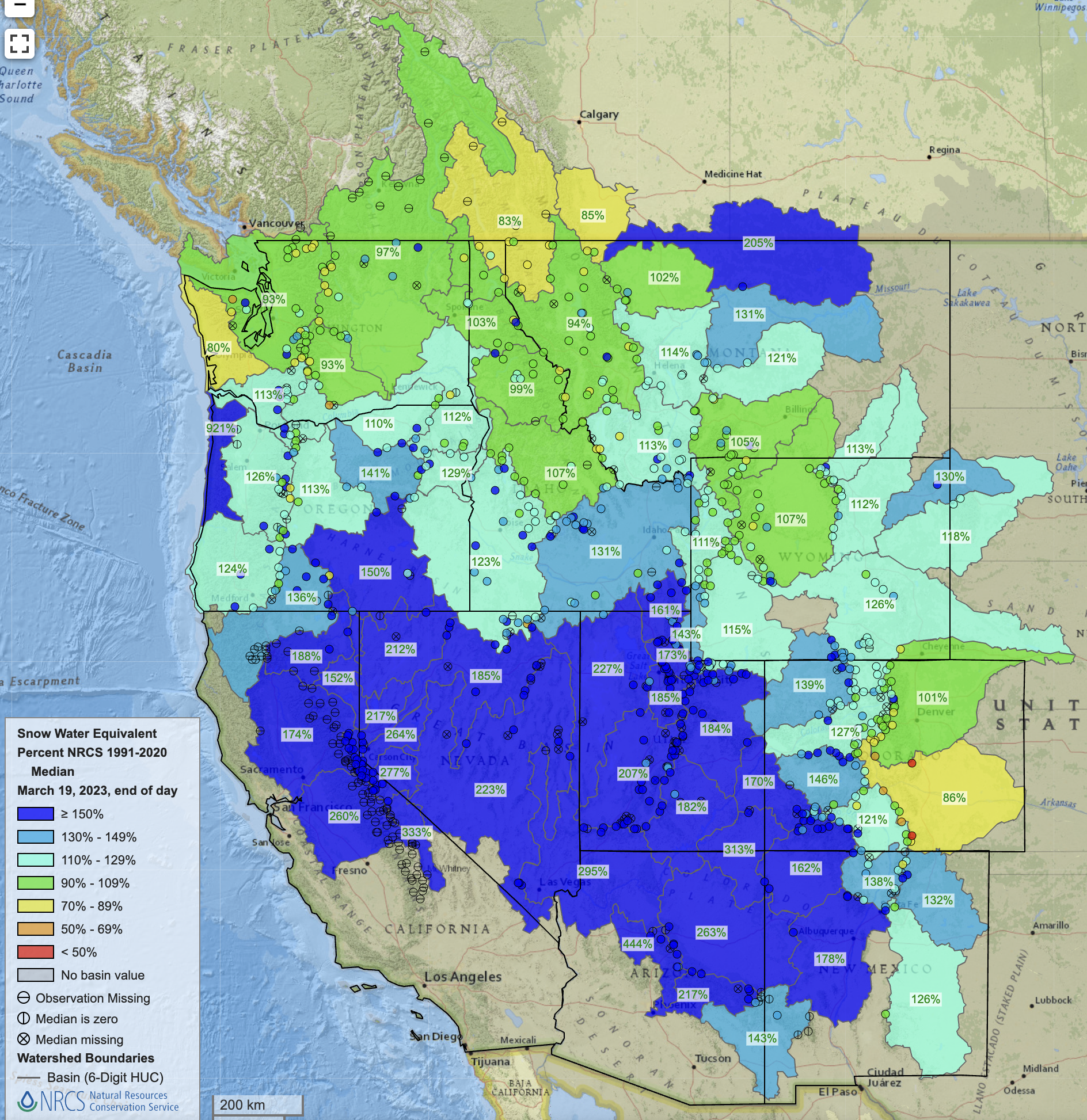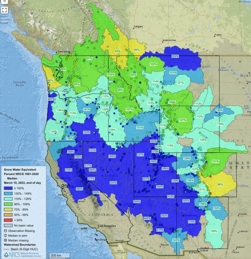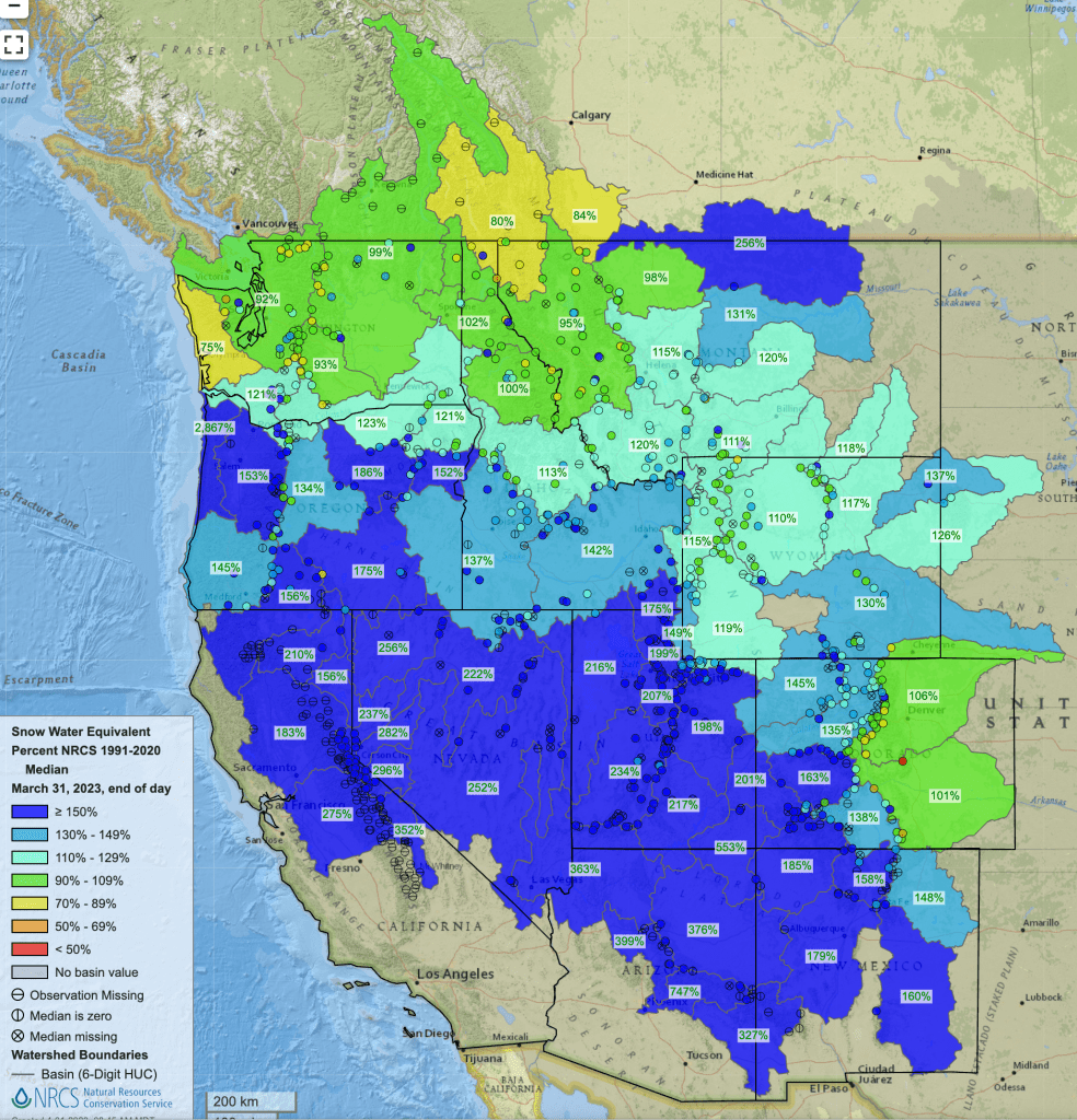Thereโs some crazy s$#%t going down out there. Or perhaps I should say, falling down out there, from the sky, as in precipitating. Moisture-laden storm after moisture-laden storm has pounded a good portion of the Western United States all winter long. Equally remarkable is that the snowpack-building precipitation and snowpack-preserving cold temperatures have continued up to the end of March and look like they will persist into April, at least (itโs snowing in Colorado as I write this). That will extend the longevity of the snowpack and make a robust runoff more likely.