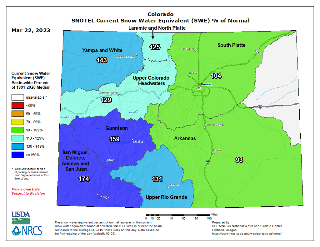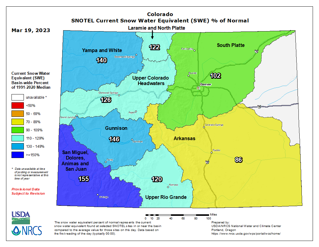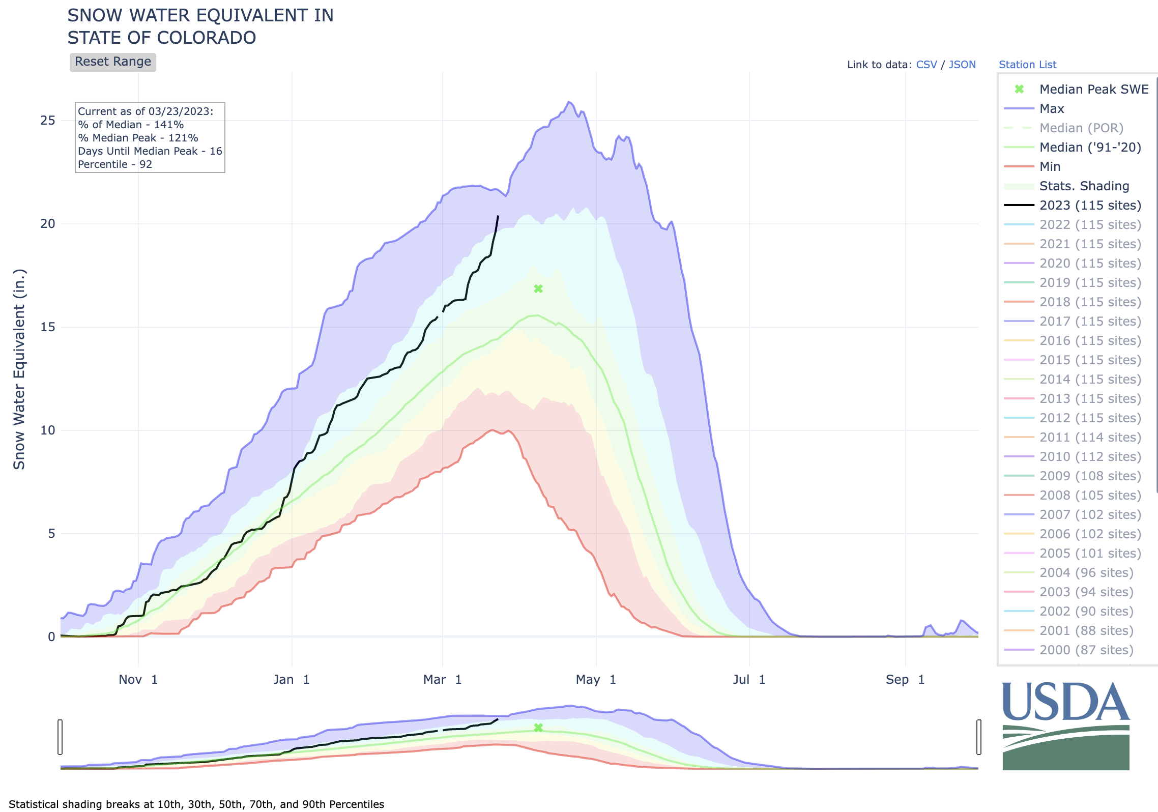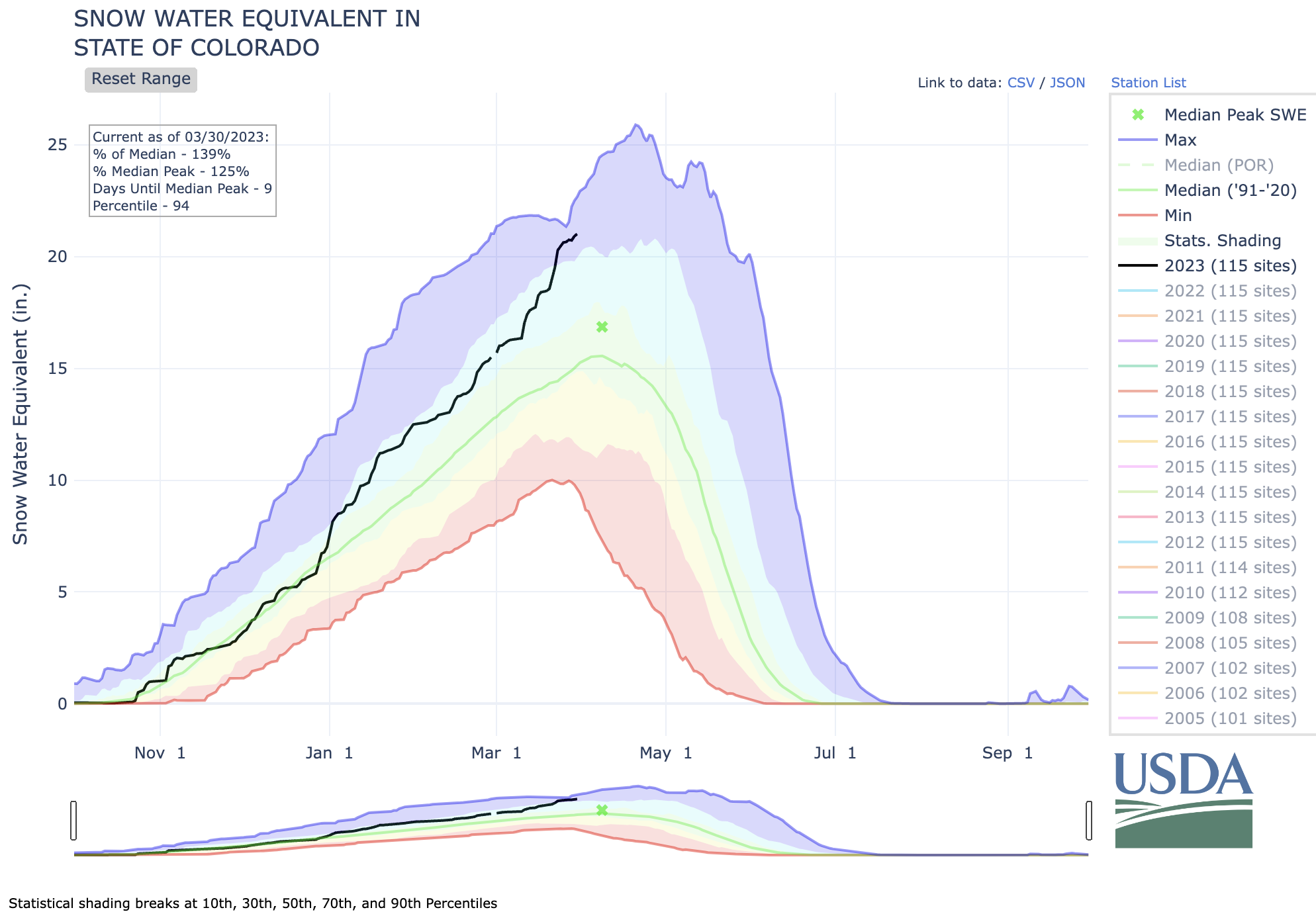 Thereโs some crazy s$#%t going down out there. Or perhaps I should say, falling down out there, from the sky, as in precipitating. Moisture-laden storm after moisture-laden storm has pounded a good portion of the Western United States all winter long. Equally remarkable is that the snowpack-building precipitation and snowpack-preserving cold temperatures have continued up to the end of March and look like they will persist into April, at least (itโs snowing in Colorado as I write this). That will extend the longevity of the snowpack and make a robust runoff more likely.