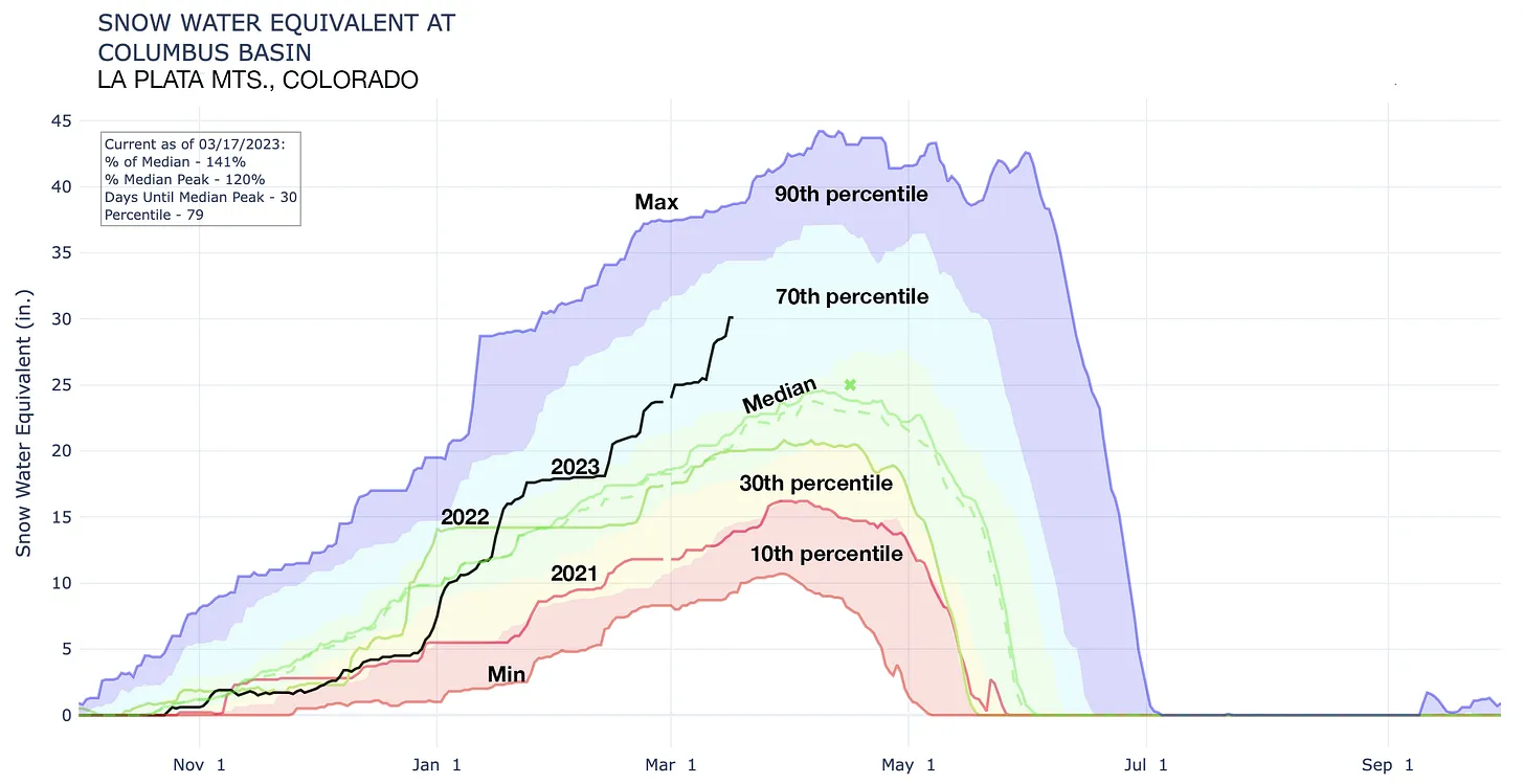 The aridification of the last couple decades has hit the La Platas especially hard. Even when the southwest Colorado range gets good snow, it tends to melt out more quickly than in the higher mountains to the north, leaving little more than trickles in the La Plata and Mancos River beds come mid-summer. But this year the range has been a major beneficiary of the abundance: The Columbus Basin SNOTEL station is now recording snow water equivalents far above the median peak, which usually happens in mid-April.