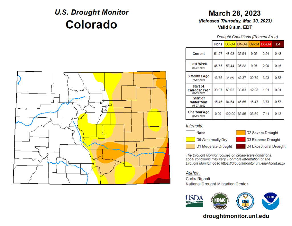 What a difference a couple of years makes, no? This is the Animas Valley/Durango and surroundings two years ago and today. Notice how at the end of March 2021 nearly all the snow was gone from the north face of Smelter Mountain, a sign that itโs almost time to plant crops outside โ which in times of yore often came around Motherโs Day. Iโm guessing there may still be snow on Smelter come early May this year. Source: Sentinel Hub