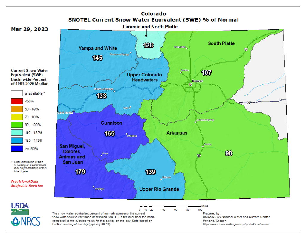 Snowpack in the Roaring Fork basin, which is exceeding the basin-wide median seasonal snow-water equivalent peak of 17.1 inches that typically occurs in mid-April, reached an average of 21.9 inches of snow-water equivalent per site on March 26 or 145% of median according to NRCS. Snowpack gained about three inches of SWE since last week on average per site after recent snow storms.