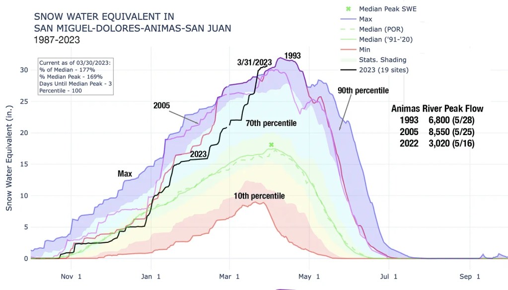 Graphs and statistics aside, let me just assure you that there is a shยถยงt ton of snow in the Animas River watershed right now. Thatโs just a personal observation, but damn โฆ
